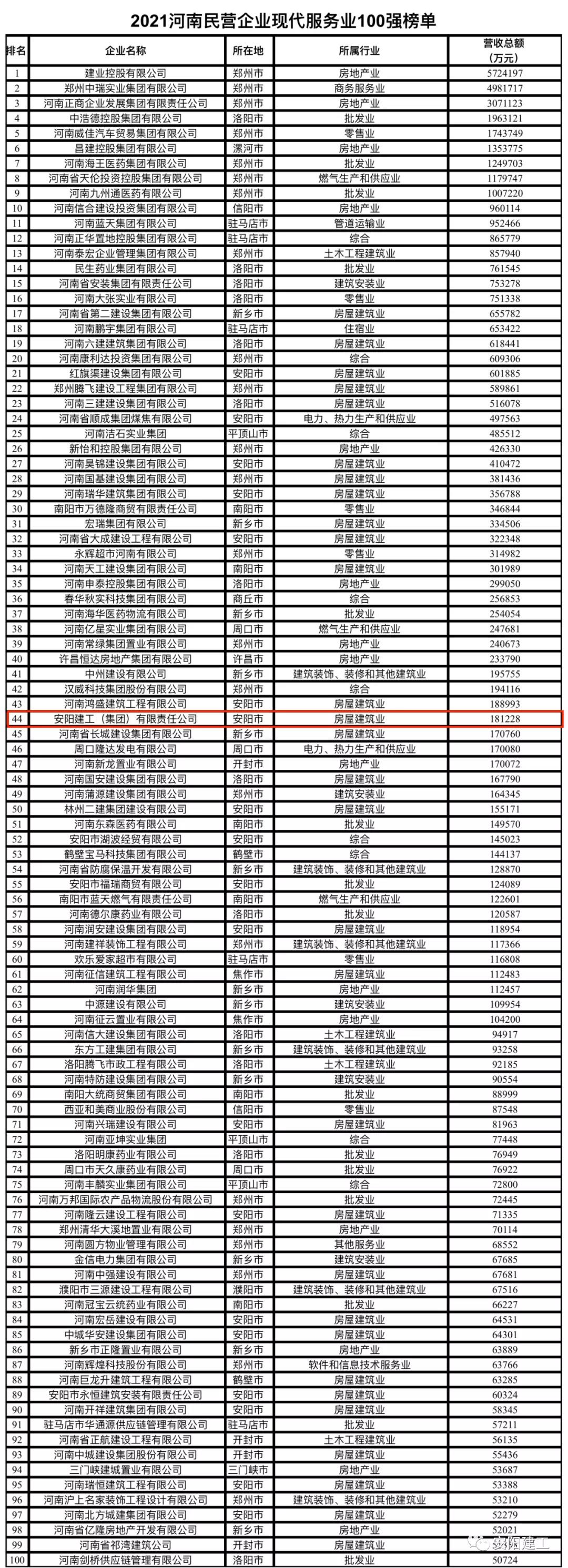 12月8日,省政府新聞辦舉行2021河南民營企業100強新聞發布會,公布2021河南民營企業100強榜單。以企業2020年度營業收入總額為基本標準,現產生出“2021河南民營企業100強榜單”,以行業類別和企業2020年度營業收入總額為基本標準,產生出“2021河南民營企業制造業100強榜單”、“2021河南民營企業現代服務業100強榜單”。我公司再次喜獲2021年河南省民營企業現代服務業100強榮譽!