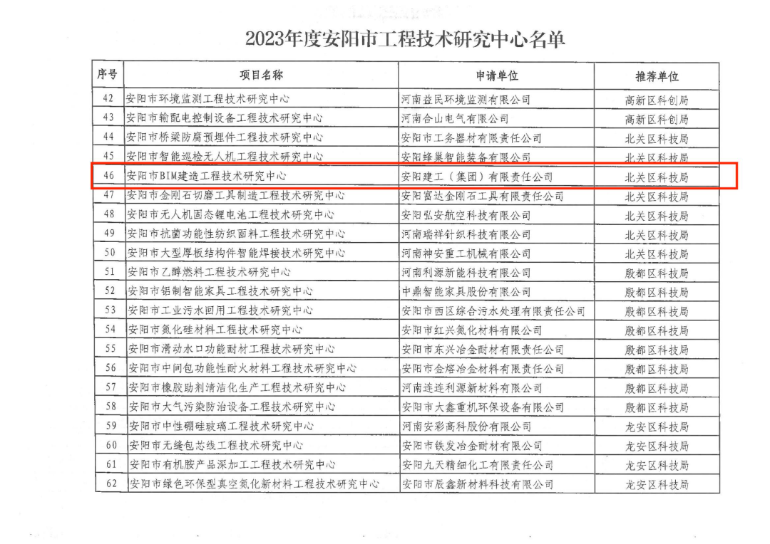 2023年9月,安陽市科技局發(fā)布了《關(guān)于認(rèn)定2023年度安陽市工程技術(shù)研究中心和重點(diǎn)實(shí)驗(yàn)室的通知 》(安科〔2023〕84號(hào)),我公司申請(qǐng)組建的“安陽市BIM建造工程技術(shù)研究中心”經(jīng)過積極申報(bào),主管部門層層審核,被成功認(rèn)定為“安陽市工程技術(shù)研究中心”,這是對(duì)我公司具備行業(yè)領(lǐng)先的研究開發(fā)與創(chuàng)新能力的認(rèn)可。