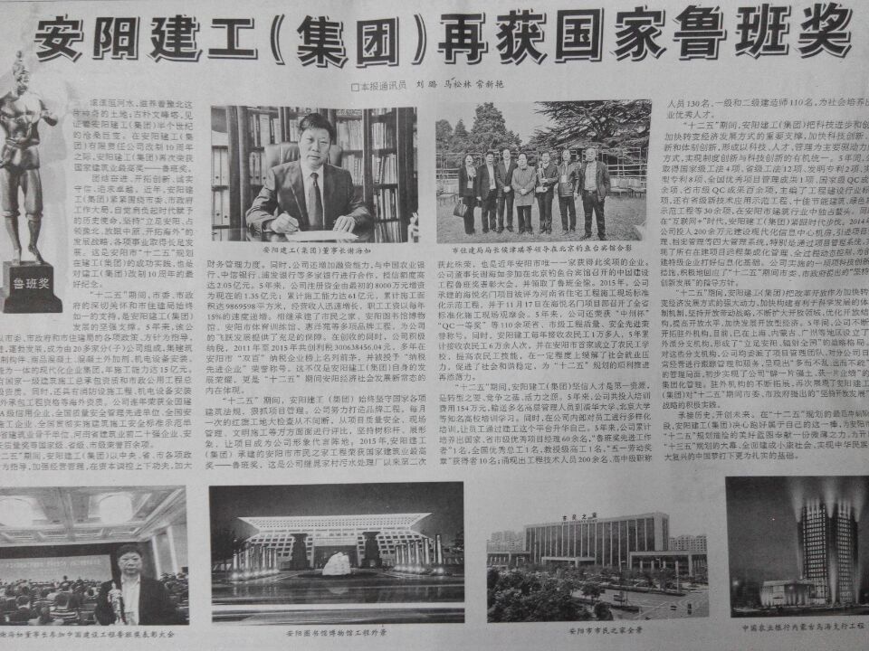 櫛風沐雨,10年光輝歲月;波瀾壯闊,10年奮斗歷程。在安陽建工(集團)改制10周年之際,公司承建的“安陽市市民之家”工程再次榮獲國家建筑業最高獎------魯班獎,這是安陽建工集團繼晁家村污水處理廠以來第二次獲此殊榮。 前不久,安陽市政府、安陽日報聯合開展了“十二五”宣傳活動,經市住建局推薦,集團辦公室馬松林、常新艷、劉璐寫稿的《安陽建工(集團)再獲國家魯班獎》榮登2015年12月10日安陽日報第二版。