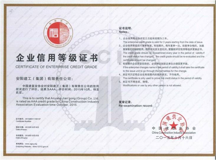 2016年1月7日,中國(guó)建筑業(yè)協(xié)會(huì)在珠海隆重召開全國(guó)建筑業(yè)AAA級(jí)信用企業(yè)暨中國(guó)建筑業(yè)雙百?gòu)?qiáng)企業(yè)發(fā)布會(huì),向我公司在內(nèi)的共277家2015年度全國(guó)建筑業(yè)AAA級(jí)信用企業(yè)和榮獲2014年度雙百?gòu)?qiáng)的企業(yè)頒發(fā)獎(jiǎng)牌和證書,我公司很榮幸的作為企業(yè)代表上臺(tái)領(lǐng)取了AAA級(jí)信用企業(yè)證書。