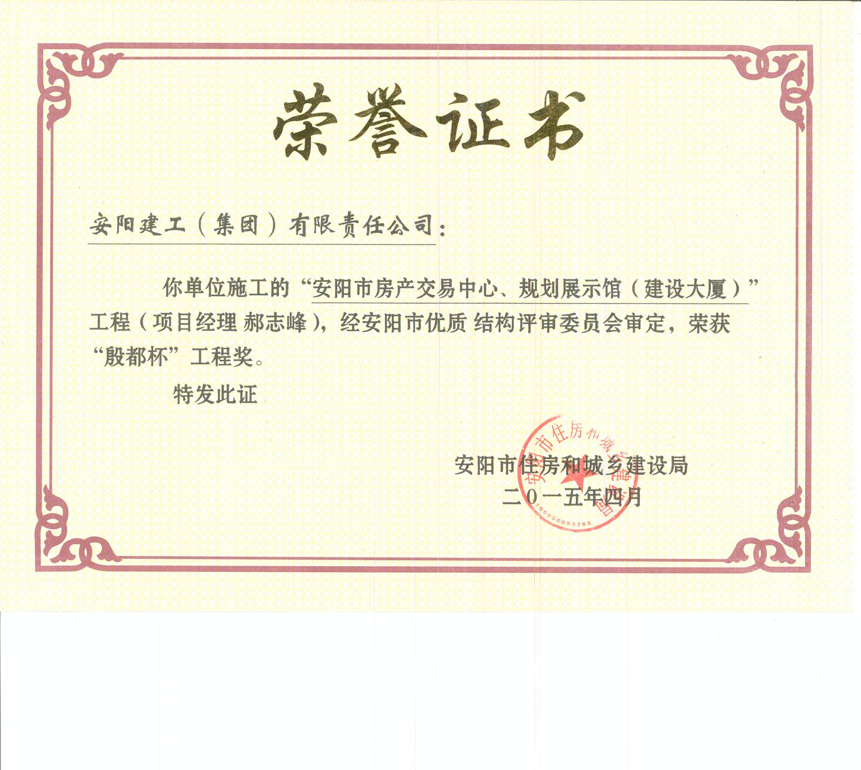 我單位承建的“安陽市房產交易中心、規(guī)劃展示館(建設大廈)”工程榮獲“殷都杯”工程獎