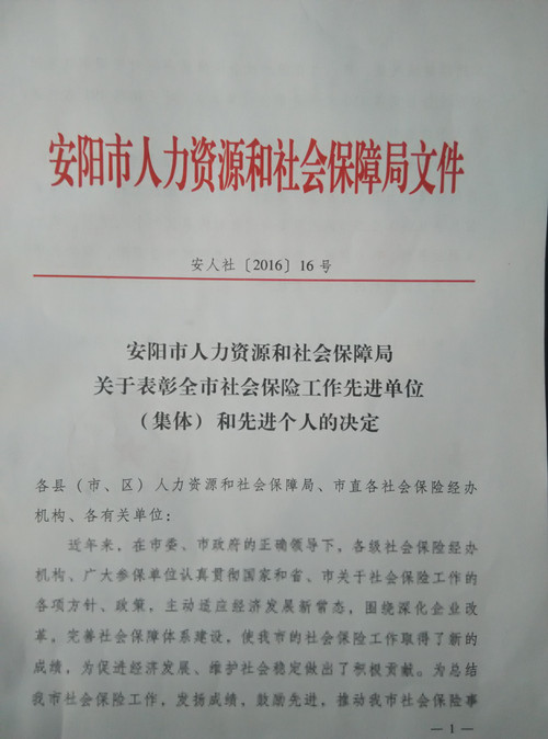 近年來,我單位社會保險工作政策認真貫徹國家和省、市各項相關政策、方針,主動適應經濟發展新常態,圍繞社會深化改革,完善社會保障體系建設,在我市社會保險工作中又一次取得新的成績,為促進社會經濟發展,維護社會穩定做出積極貢獻,在2014-2015年度社會保險工作中被評為“先進單位”,公司副總盧麗娜同志被授予“安陽市社會保險先進個人”榮譽稱號。