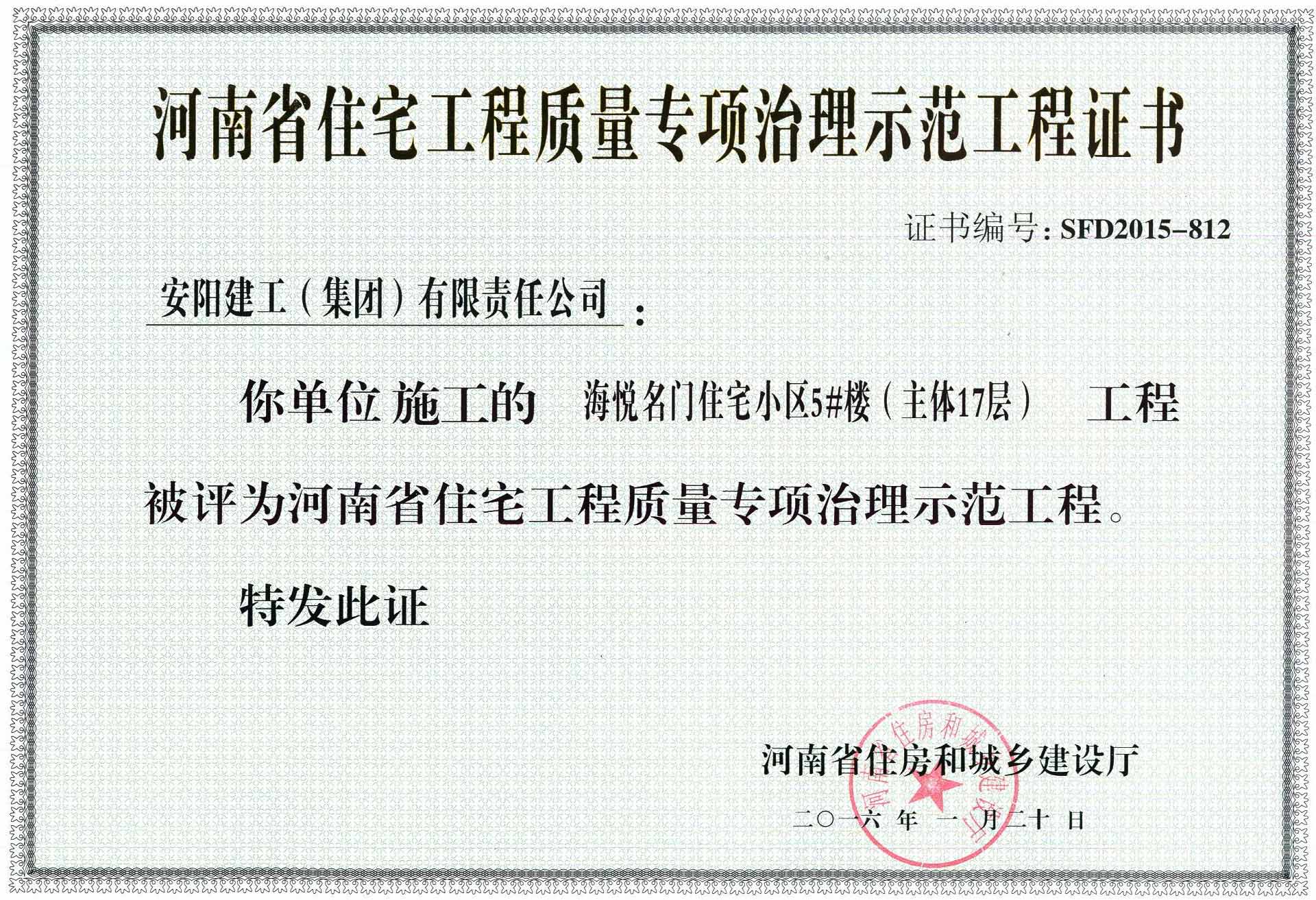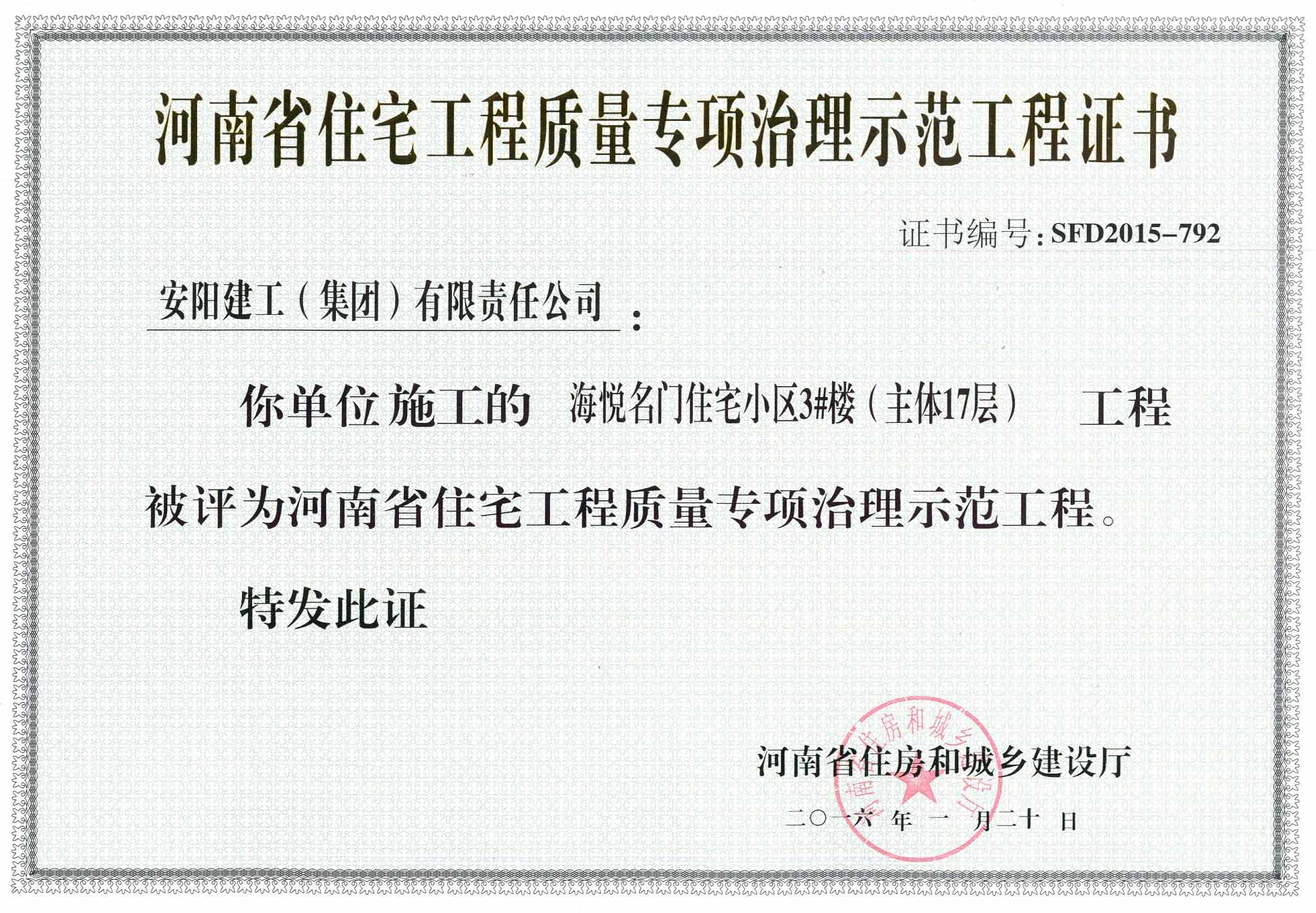 我公司施工的海悅名門住宅小區3#樓、4#樓、5#樓、6#樓工程榮獲“2015年度河南省住宅工程質量專項治理示范工程”榮譽。這是我公司按照住房和城鄉建設部工程質量兩年專項治理活動的工作部署以及《關于做好全省住宅工程質量專項質量示范工程評審工作的通知》要求,由安陽市住房和城鄉建設主管部門推薦申報,專家組現場復查,河南省住宅質量示范工程評審委員會評審之后得到的評價。