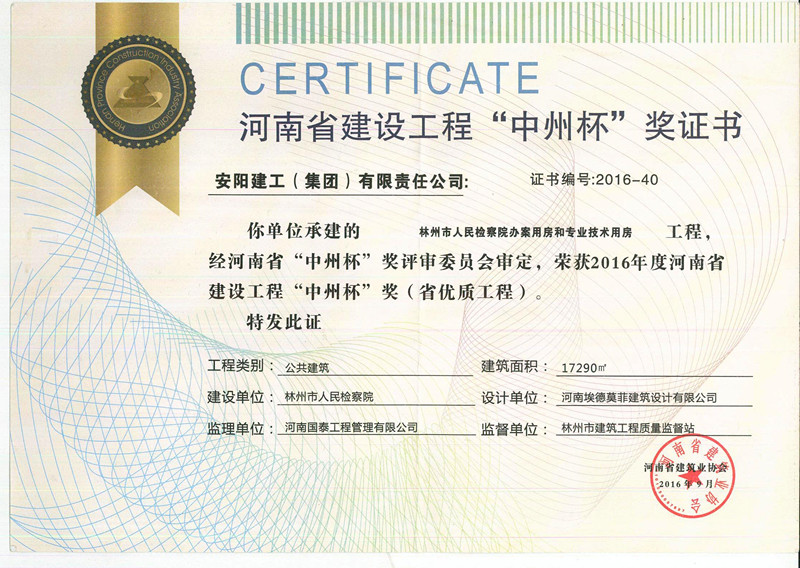 我單位承建的 林州市人民檢察院辦案用房和專業技術用房工程榮獲2016年河南省建設工程“中州杯獎”