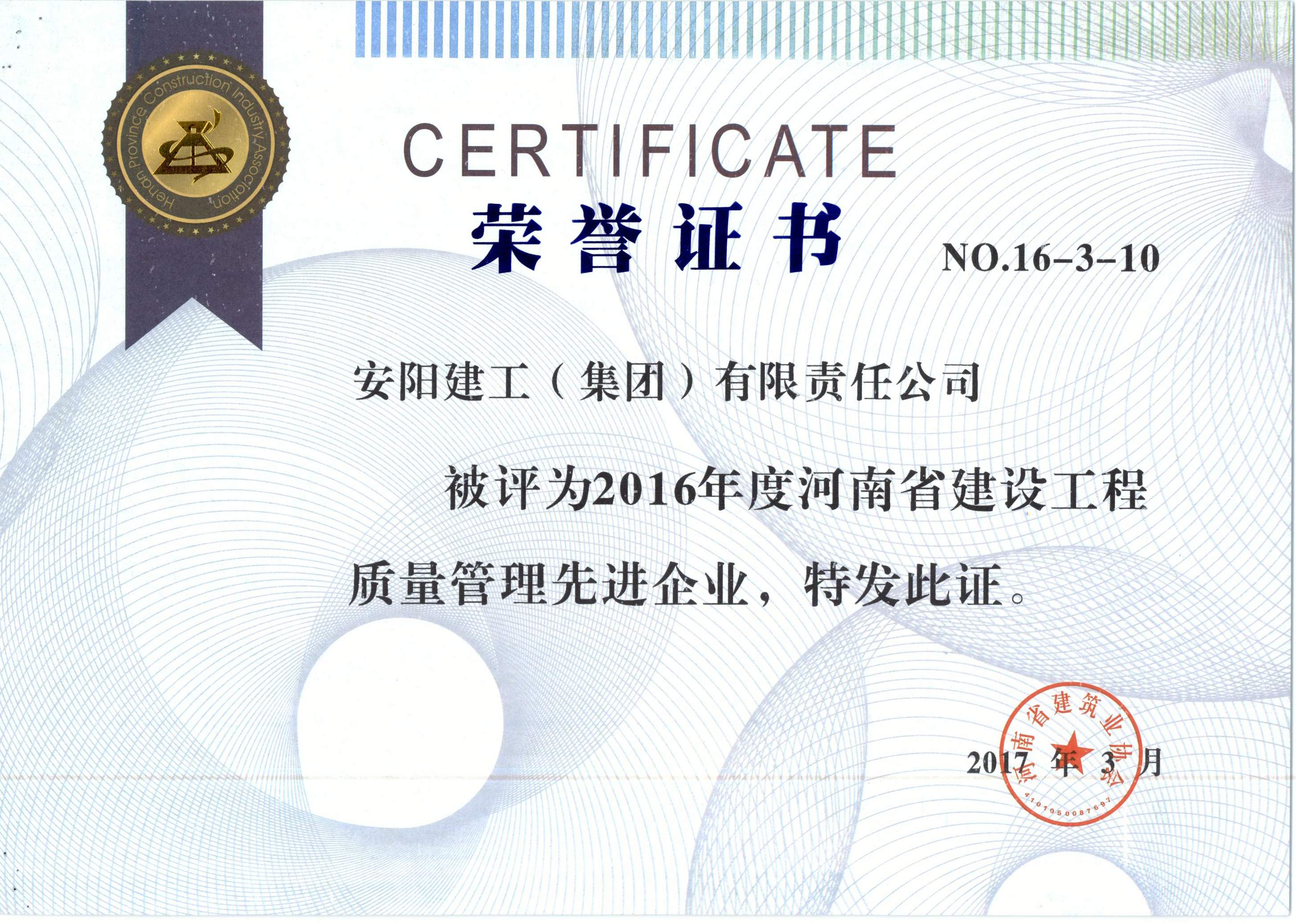 我公司被評為2016年河南省建設工程質量管理先進企業