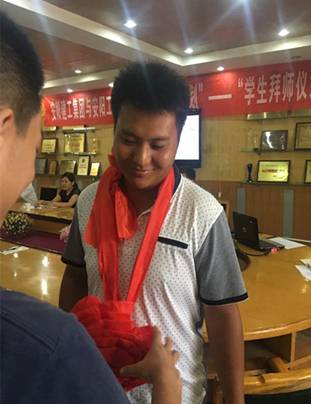 拜師儀式上,學(xué)生向自己的師傅鞠躬、敬茶,獻(xiàn)花,行拜師禮。指導(dǎo)老師代表原國瑞發(fā)言表態(tài),“一定恪盡職守,全力教導(dǎo),起到帶頭示范作用”,學(xué)生代表在隨后的發(fā)言中表示,“一定虛心請(qǐng)教,把師傅作為學(xué)習(xí)的楷模”。