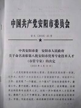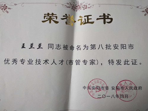 仲夏五月,喜訊傳來,公司董事王蘭蘭被命名為第八批安陽市優(yōu)秀專業(yè)技術人才(市管專家)。繼董事長謝海如2013年被評命名為市管專家后公司第二人獲此殊榮。