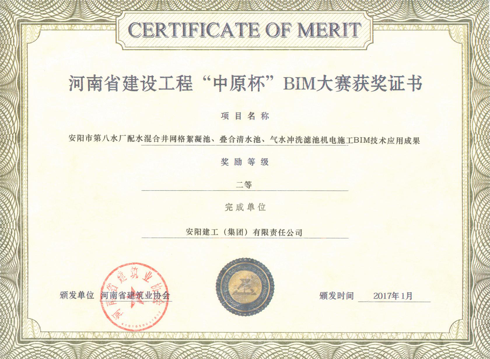 河南省建設工程“中原杯”BIM大獎獲獎證書。