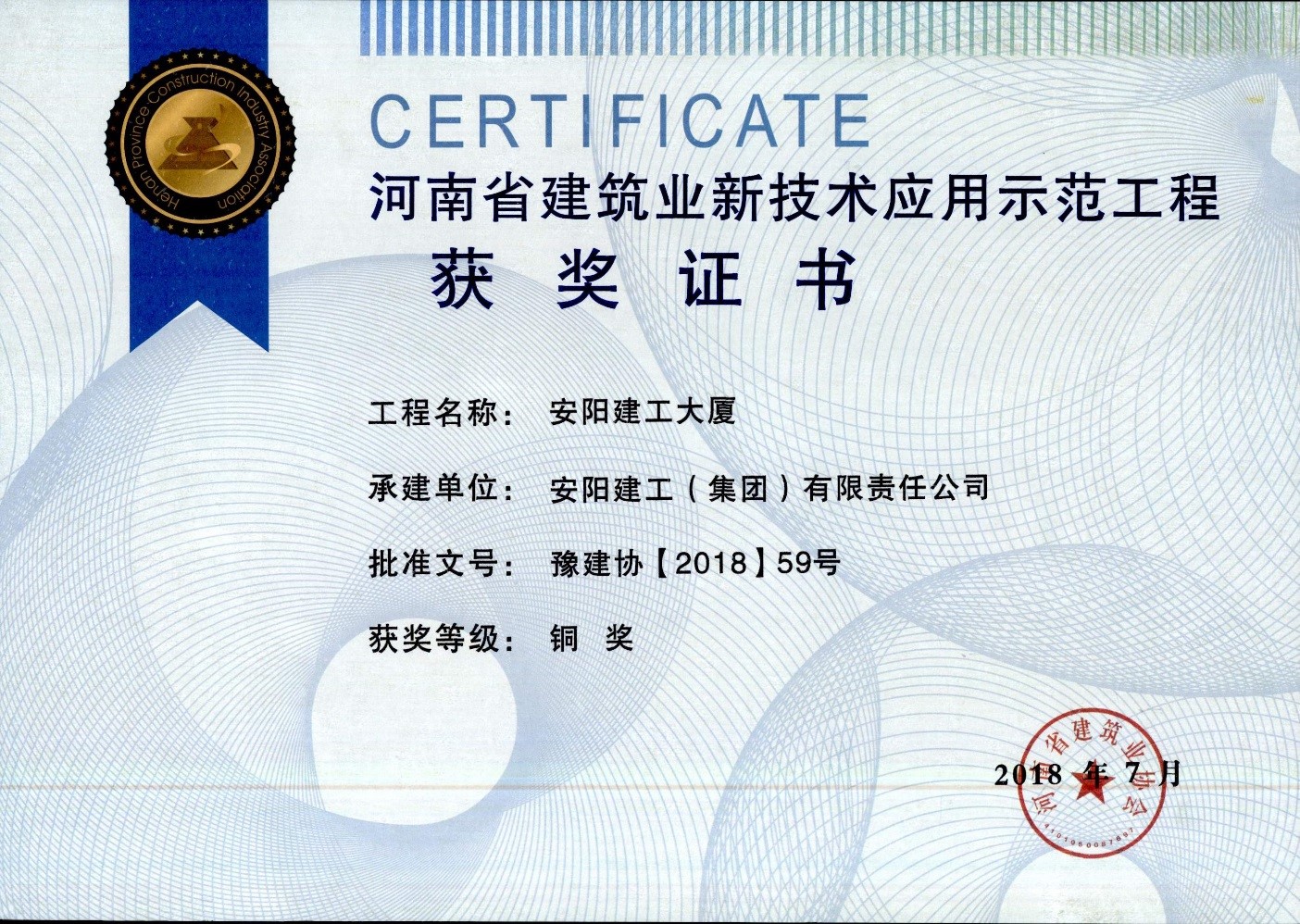我公司安陽建工大廈項目榮獲18年省建筑業新技術應用示范工程