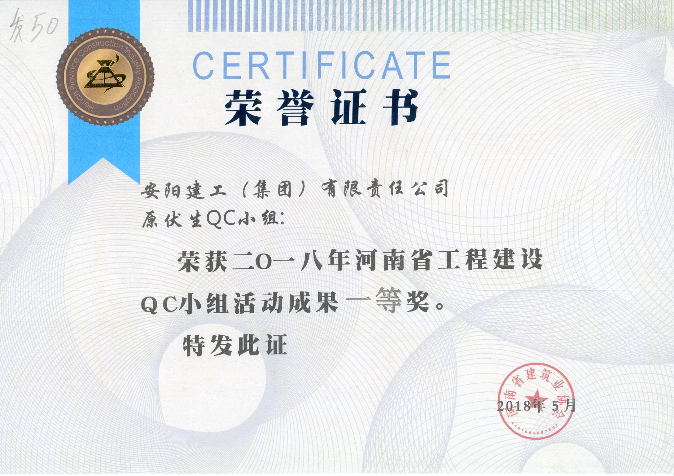 我公司原伏生QC小組榮獲2018年河南省工程建設(shè)QC小組活動(dòng)成果一等獎(jiǎng)