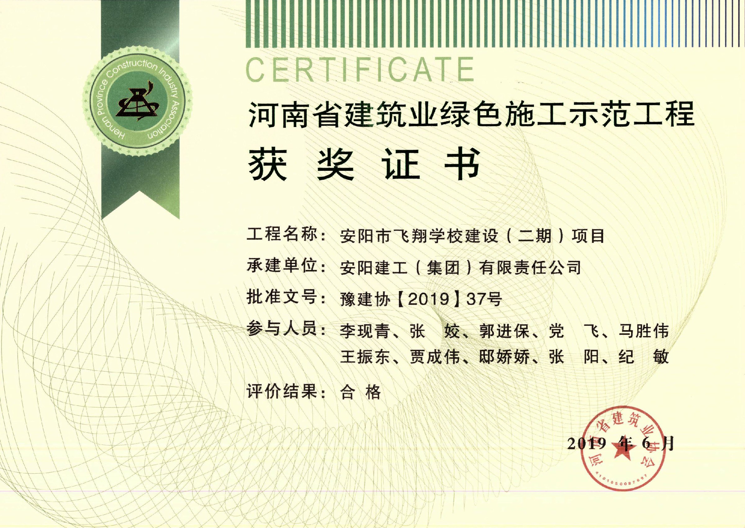 我公司安陽市飛翔學校二期項目榮獲19年省建筑業綠色施工示范工程