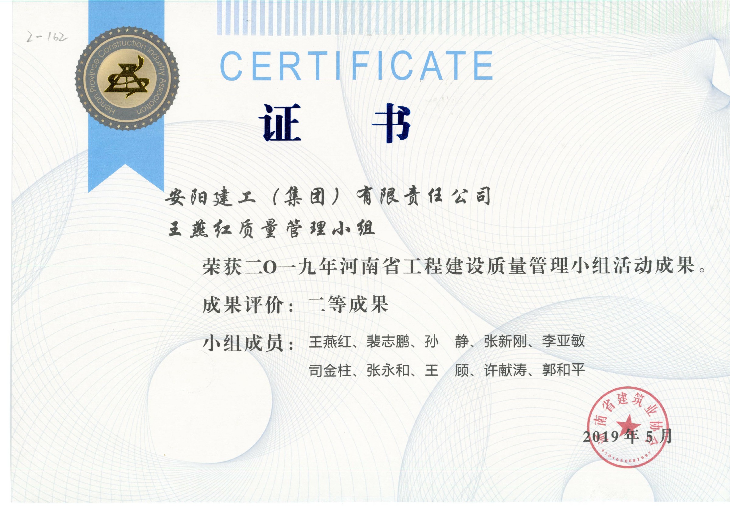 我公司王燕紅QC小組榮獲2019年河南省工程建設QC小組活動成果二等獎