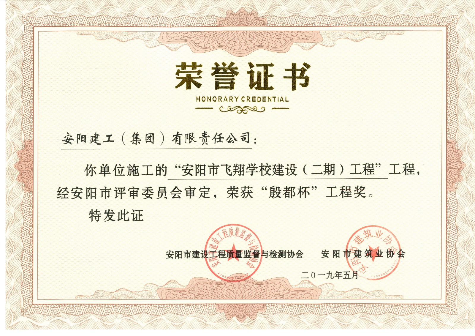 我公司承建的安陽市飛翔學校二期項目榮獲2019年度安陽市殷都杯工程獎
