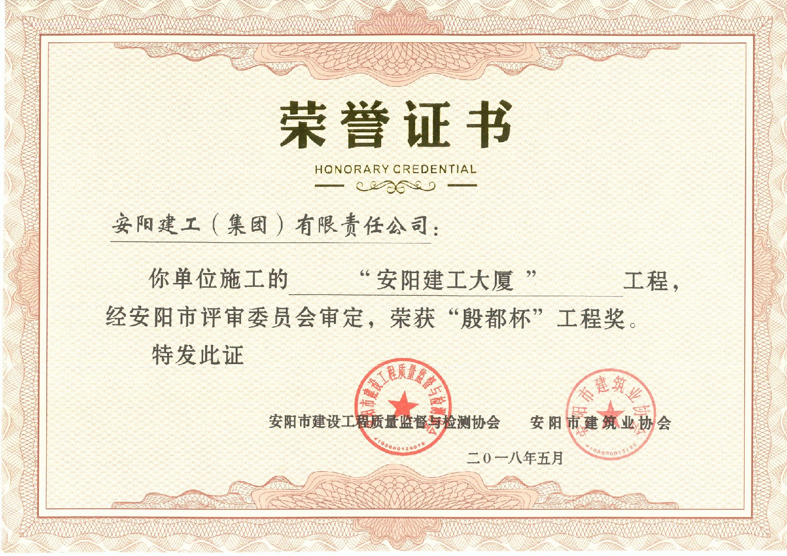 我公司承建的安陽市建工大廈項目榮獲2018年度安陽市殷都杯工程獎