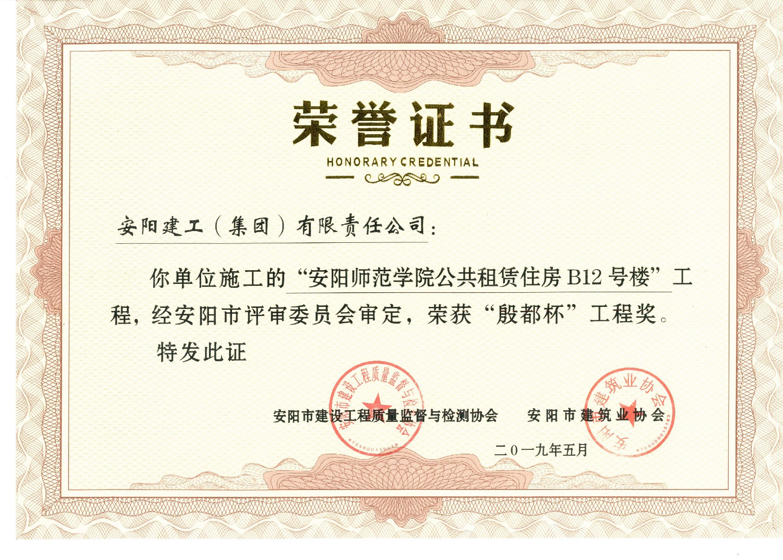 我公司承建的安陽市師范學院公共租賃住房B12#樓項目榮獲2019年度安陽市殷都杯工程獎