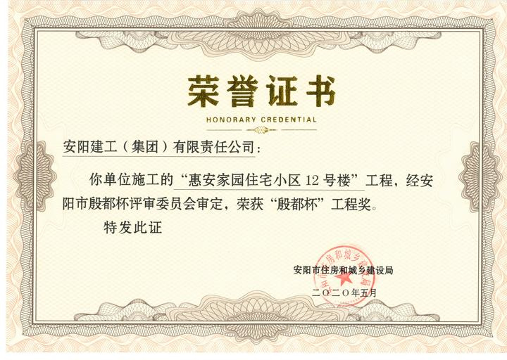 我公司承建的安陽市惠安家園9#12#樓項目榮獲2020年度安陽市殷都杯工程獎
