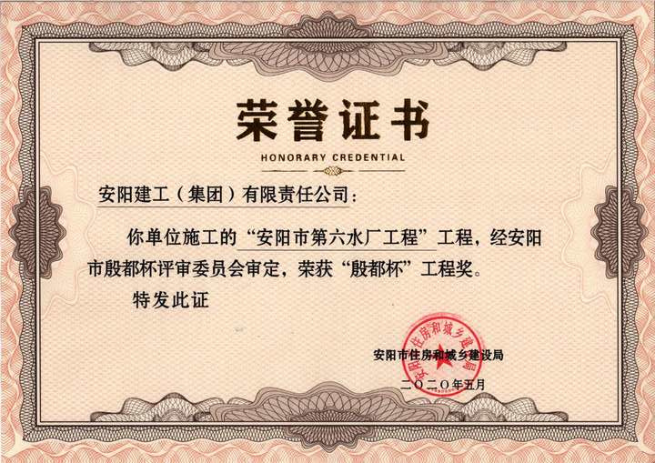 我公司承建的安陽市第六水廠項目榮獲2020年度安陽市殷都杯工程獎