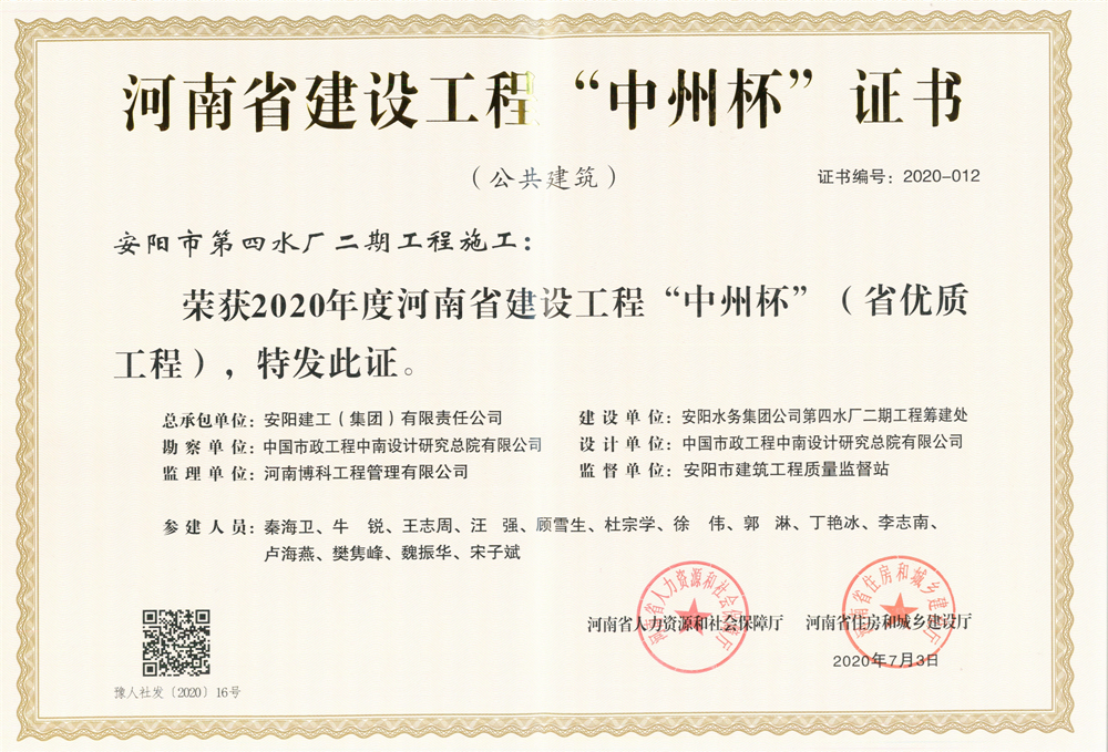 由我公司承建的“安陽市第六水廠”、“安陽市第四水廠二期”、“安陽攀高教育園區(qū)(一期)”工程被評為2020年度河南省建設工程“中州杯”獎。