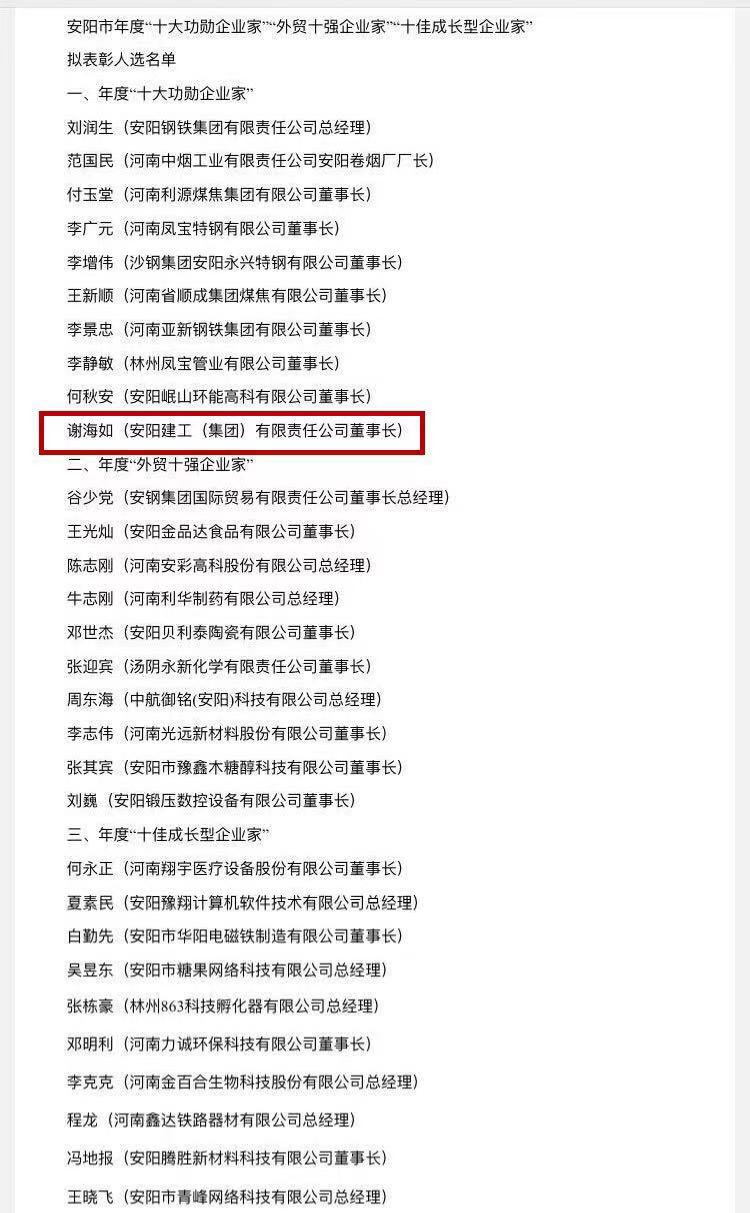 喜訊!集團公司董事長謝海如同志入圍2020年度安陽市“十大功勛企業家”名單