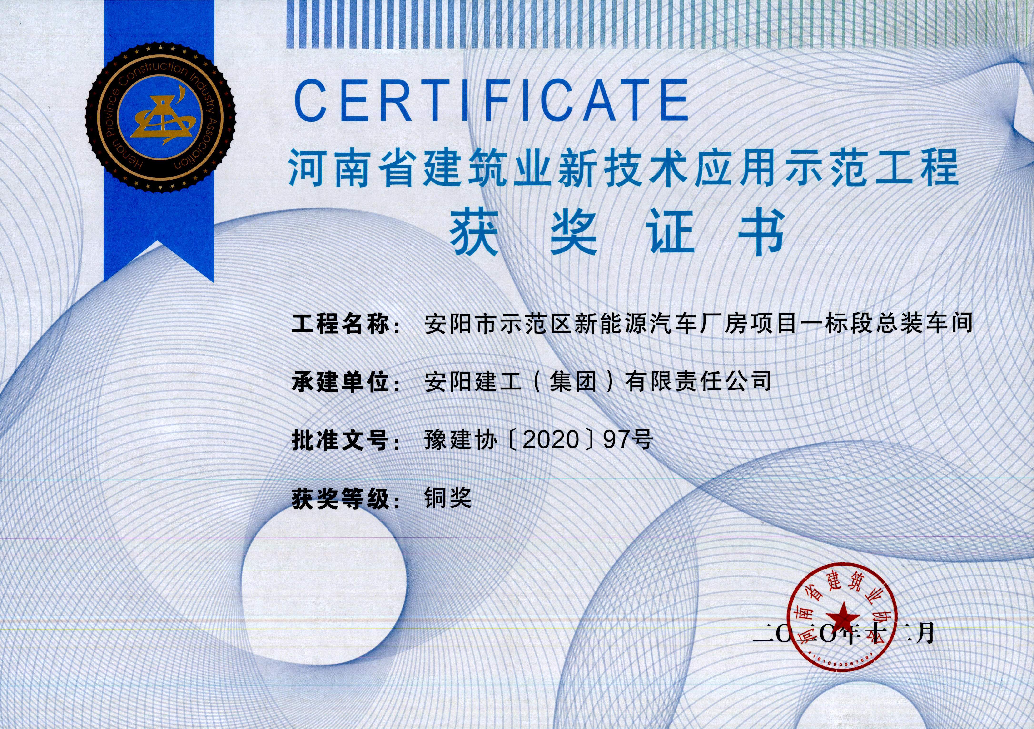 我公司安陽市示范區(qū)新能源汽車廠房項目一標段總裝車間榮獲河南省建筑業(yè)新技術(shù)應(yīng)用范工程