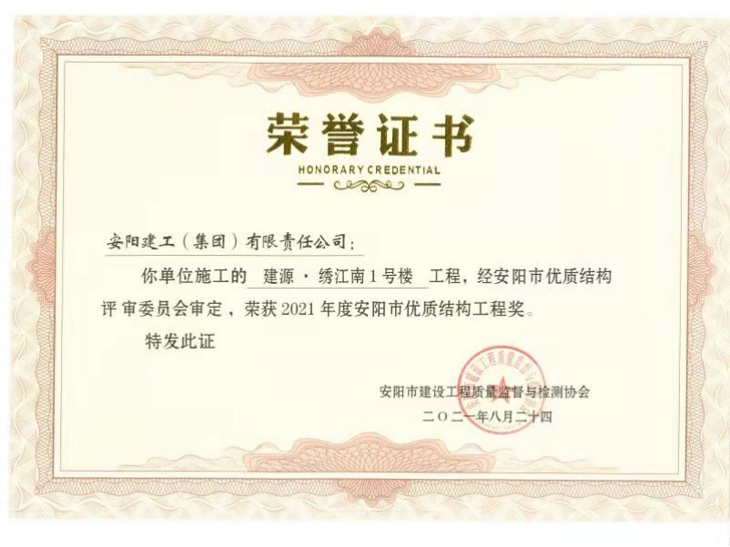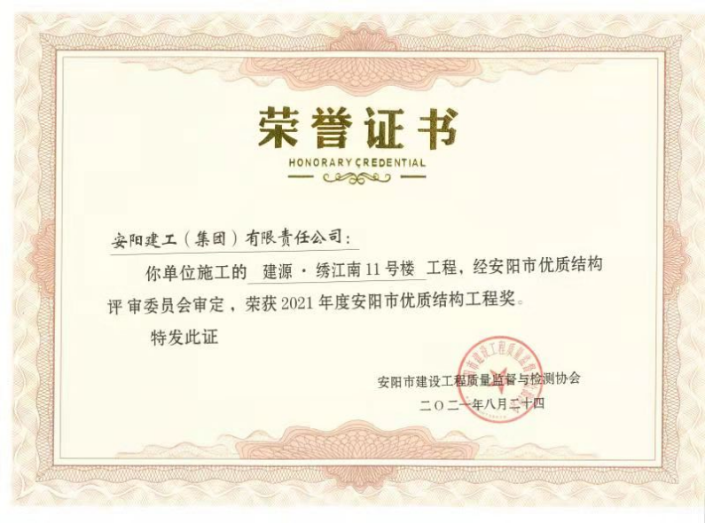 建源·繡江南項目喜獲安陽市優質結構工程獎 金秋九月,桂花飄香,建源繡江南項目經過一年半的緊張施工,已進入裝飾裝修階段。經過參建方的共同努力,在2021年9月3日,建源·繡江南1#、6#、11#樓榮獲安陽市優質結構獎。