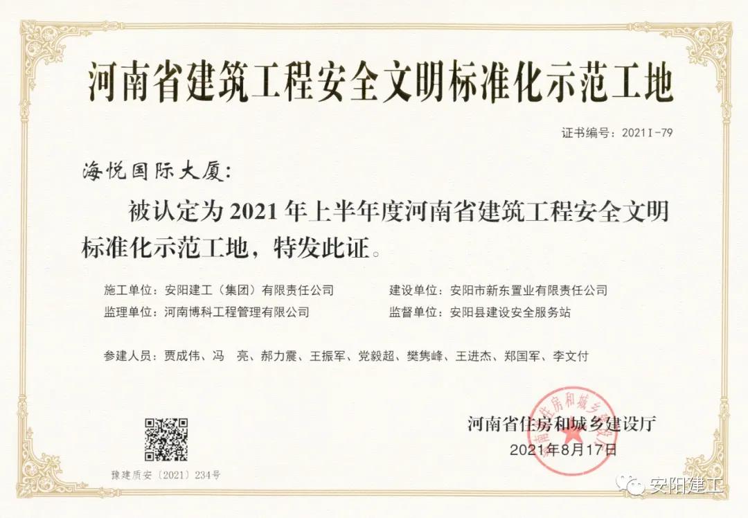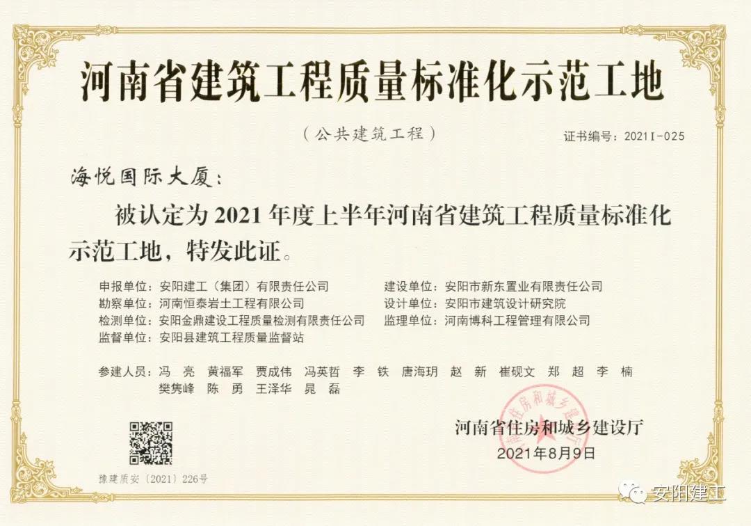 海悅國(guó)際大廈被河南省住建廳授予“2021年度上半年河南省建筑工程安全文明標(biāo)準(zhǔn)化示范工地”和“2021年度上半年河南省建筑工程質(zhì)量標(biāo)準(zhǔn)化示范工地”(“雙標(biāo)準(zhǔn)化”示范工地)。