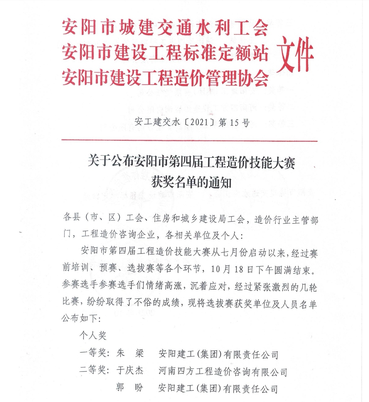 2021年10月18日,“安陽市第四屆工程造價技能大賽安陽選拔賽”圓滿成功!經過賽前培訓、預賽、選拔賽等各個環節的層層選拔,我集團公司喜獲團體獎一等獎,參賽選手朱梁和郭盼喜獲個人獎一等獎、二等獎!