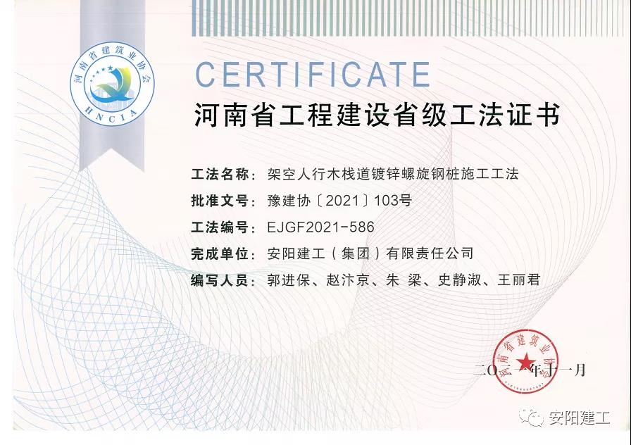 近日,集團(tuán)公司技術(shù)創(chuàng)新成果再創(chuàng)佳績。公司申報的《架空人行木棧道鍍鋅螺旋鋼樁施工工法》順利通過河南省建筑業(yè)協(xié)會專家評審,榮獲2021年“河南省省級工法”。與此同時,公司“安陽市城鄉(xiāng)一體化示范區(qū)南務(wù)城中村改造安置房3#住宅樓項目”結(jié)項申報的新技術(shù)應(yīng)用示范工程和綠色施工示范工程,通過專家評審驗收,榮獲“河南省建筑業(yè)新技術(shù)應(yīng)用示范工程獲銀獎”、“河南省建筑業(yè)綠色施工示范工程”。