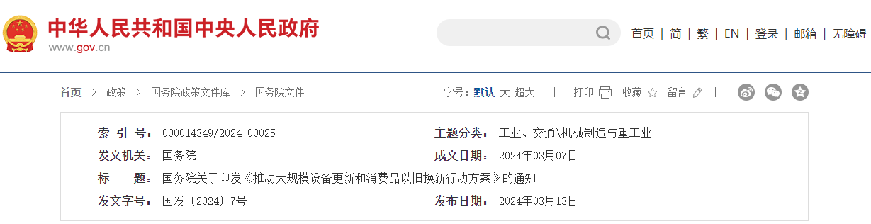 國務(wù)院關(guān)于印發(fā)《推動大規(guī)模設(shè)備更新和消費品以舊換新行動方案》的通知