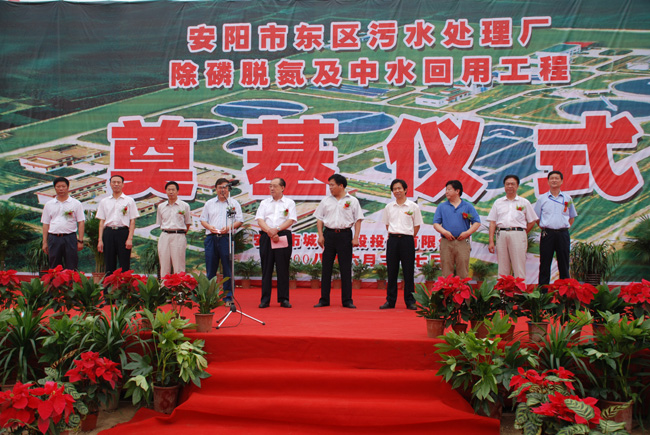 6月27日,集團公司承建的安陽市東區污水處理廠除磷脫氮及中水回用工程舉行開工奠基儀式,這是我市繼晃家村污水處理廠工程竣工后,為進一步落實科學發展觀、改善城區人居環境、構建和諧社會而實施的又一生態工程和民心工程。安陽市副市長倪豫洲等領導出席了奠基儀式,安陽市城市建設投資有限公司、首創水廠、安陽建工集團及監理單位的領導、員工參加了儀式。
